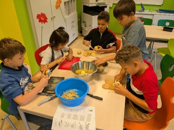 Ein besonderes Highlight des Tages war das gemeinsame Kochen des Mittagessens: Die Kinder der Kombiklasse 3/4 bereiteten das Essen für diesen Tag selbst zu. Davor hatten sie die Kartoffeln dafür selbst geerntet. Mit viel Einsatz und großer Motivation wurden zahlreiche Kartoffeln geschält und klein geschnitten. Die Mitarbeitenden übernahmen anschließend das Backen der Ofenkartoffeln, bereiteten einen leckeren Dip zu und erhitzten die Würstchen. Für viele Kinder das „beste Essen überhaupt“.